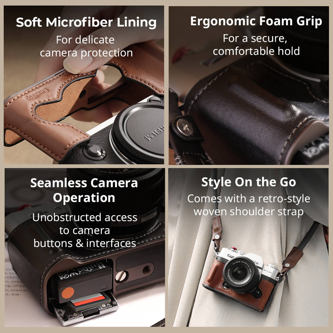The L-shaped grip maintains full access to all camera interfaces, including the battery compartment, focus ring, memory card slot, and speaker ports.